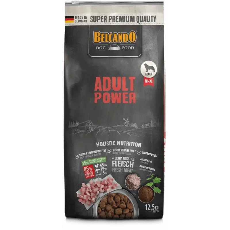 Med nøje udvalgte komponenter, masser af let fordøjeligt fjerkræ og fiskeprotein med høj biologisk værdi, især fra omega-3 fedtsyrer. Belcando Adult Power er det ideelle foder til hunde, der bruger en masse energi. Koldpresset vindruekerneolie sikrer optimal beskyttelse af celler. Det særdeles store indhold af proteiner og fedt er tilpasset det ekstreme energibehov hos hunde, som yder over gennemsnit ved arbejde, sport og i fritiden. Den høje næringsstoftæthed gør også produktet anbefalelsesværdigt til avlstæver ved slutningen af drægtigheden og under ammeperioden.