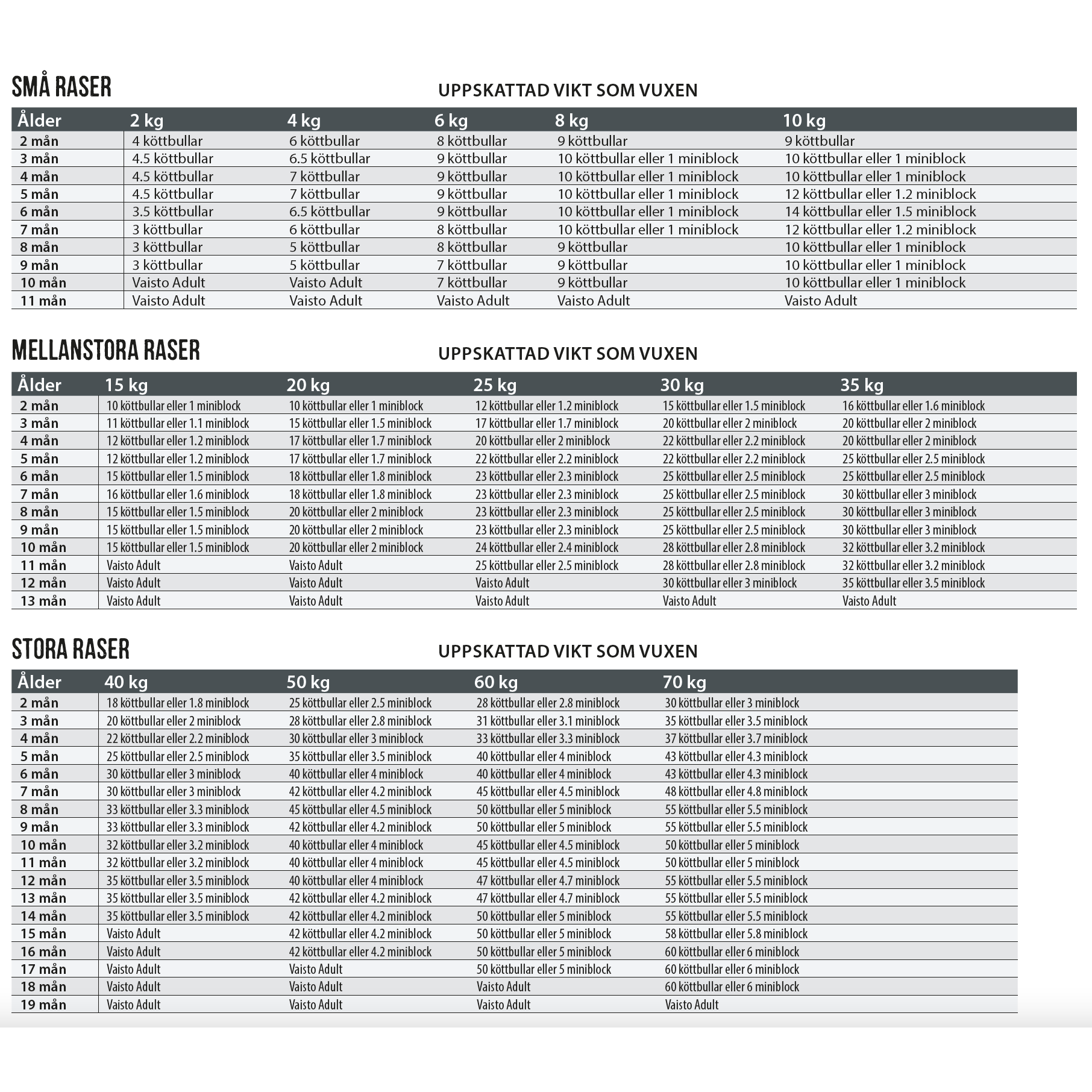I oversigten har vi noteret den gennemsnitlige fodermængde for hvalpe af forskellige aldre og racer. Husk at dette kun er en vejledende mængde, og din hvalps specifikke behov kan afvige fra tabellen.Følg med i din hvalps vækst, hold den frisk, glad og slank – tilpas dagsmængden så det stemmer.